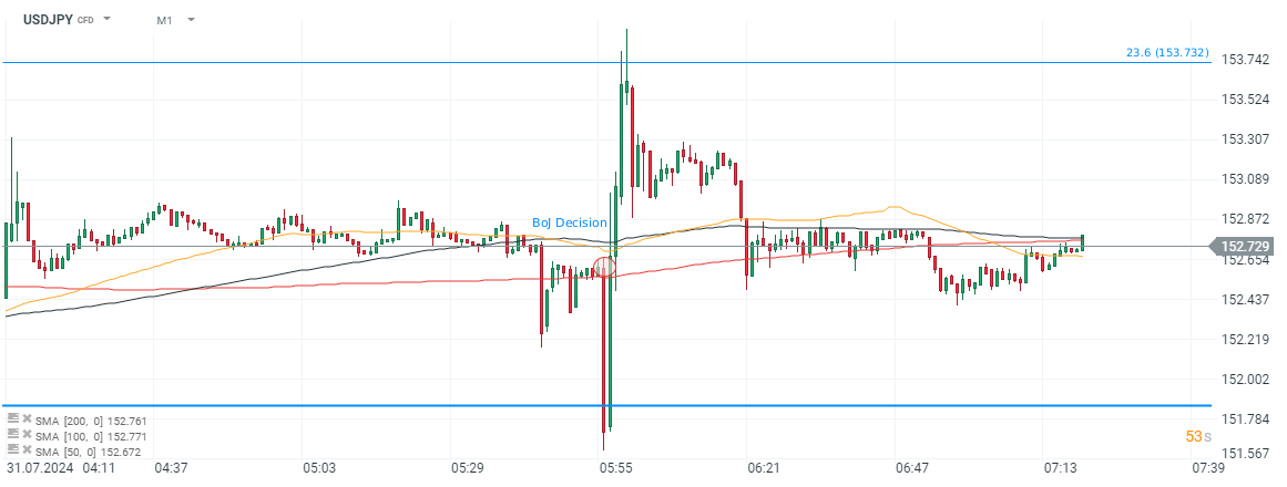 - Bank Japonii podniósł stopy o 15 punktów bazowych do 0,25% wobec prognoz utrzymania ich bez zmian, na poziomie 0,1%. Jen japoński doświadczył olbrzymiej zmienności w trakcie decyzji Banku Japonii - początkowo osłabił się do okolic 151, po czym odbił do 154. Obecnie para stabilizuje się na poziomie 152.8 i notowana jest praktycznie bez zmian w porównaniu sprzed decyzji