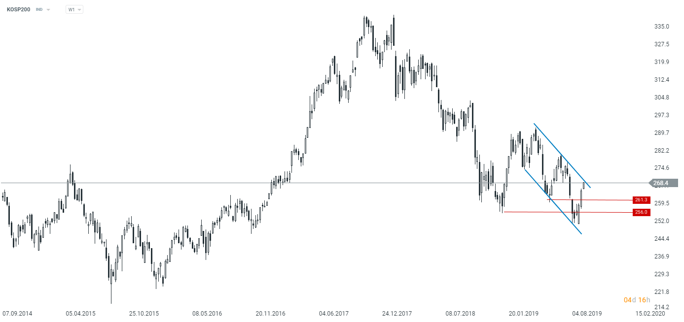 Koreański indeks dociera do poważniejszego oporu w postaci górnego ograniczenia kanału spadkowego. Źródło: xStation5
