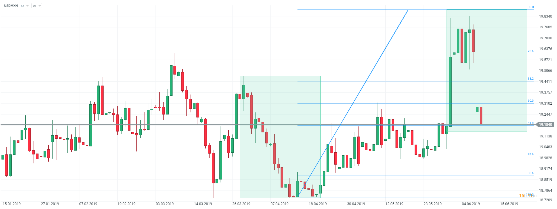 W ostanim tygodnie inwestorzy obawiali się, że wojna handlowa może rozszerzyć się na kolejne kraje, Donald Trump sugerował, że mogą zostać nałożone cła na Meksyk. Jednak ta kwestia została rozwiązana już w piątek, kiedy prezydent USA zatweetował o osiągniętym porozumieniu z Meksykiem. „Taryfy planowane do wdrożenia przez USA w poniedziałek przeciwko Meksyku zostają niniejszym zawieszone na czas nieokreślony." Jak donoszą media, Meksyk zobowiązał się do podjęcia kroków w celu powstrzymania fali migracji. Niemniej sytuacja na linii USA- Chiny jest cały czas napięta i na razie nie widać tutaj porozumienia. Dlatego też odbicie jakie widzimy na światowych parkietach, może być krótkotrwałe.