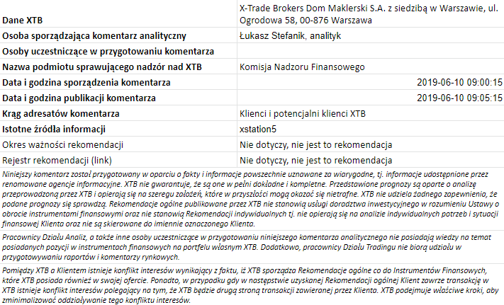 W nocy poznaliśmy także dane Chin. Dane o handlu w maju pokazały ogromny spadek importu o 8,5% w porównaniu z tym samym okresem ubiegłego roku, podczas gdy eksport wzrósł o 1,1% w ujęciu rocznym. Warto zauważyć, że import zaskoczył negatywnie, podczas gdy eksport kształtował się powyżej szacunków. W rezultacie nadwyżka handlowa wyniosła 41,65 mld USD w porównaniu do 13,84 mld USD w kwietniu. Zauważalny spadek importu może być kolejnym znakiem słabej aktywności krajowej w drugiej co do wielkości gospodarce na świecie. Z kolei wyższy eksport można przypisać efektowi front-load, należy pamiętać, że 10 maja USA zdecydowały się podwyższyć stawkę celną do 25% z 10% na chińskie towary o wartości 200 miliardów dolarów (obowiązujące od 1 czerwca). Tę hipotezę odzwierciedla również wyższa nadwyżka handlowa z USA, która wyniosła 26,9 mld USD w porównaniu z 21,1 mld USD w kwietniu.