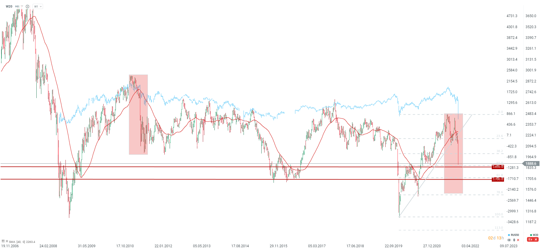 WIG20 traci ponad 7%. Kluczowe wsparcie to okolice 1850 przy zniesieniu 50.0 całego "pandemicznego" odbicia. Obecna struktura spadków bardzo przypomina to co działo się w 2011 roku. Zakres spadków wyniósł wtedy od szczytu niemal 1000 punktów, co obecnie wskazywałoby na okolice 1500 punktów. Warto zauważyć, że 1700 punktów to kluczowe wsparcie wynikające z dołków z 2015 oraz 2016 roku. Źródło: xStation5
