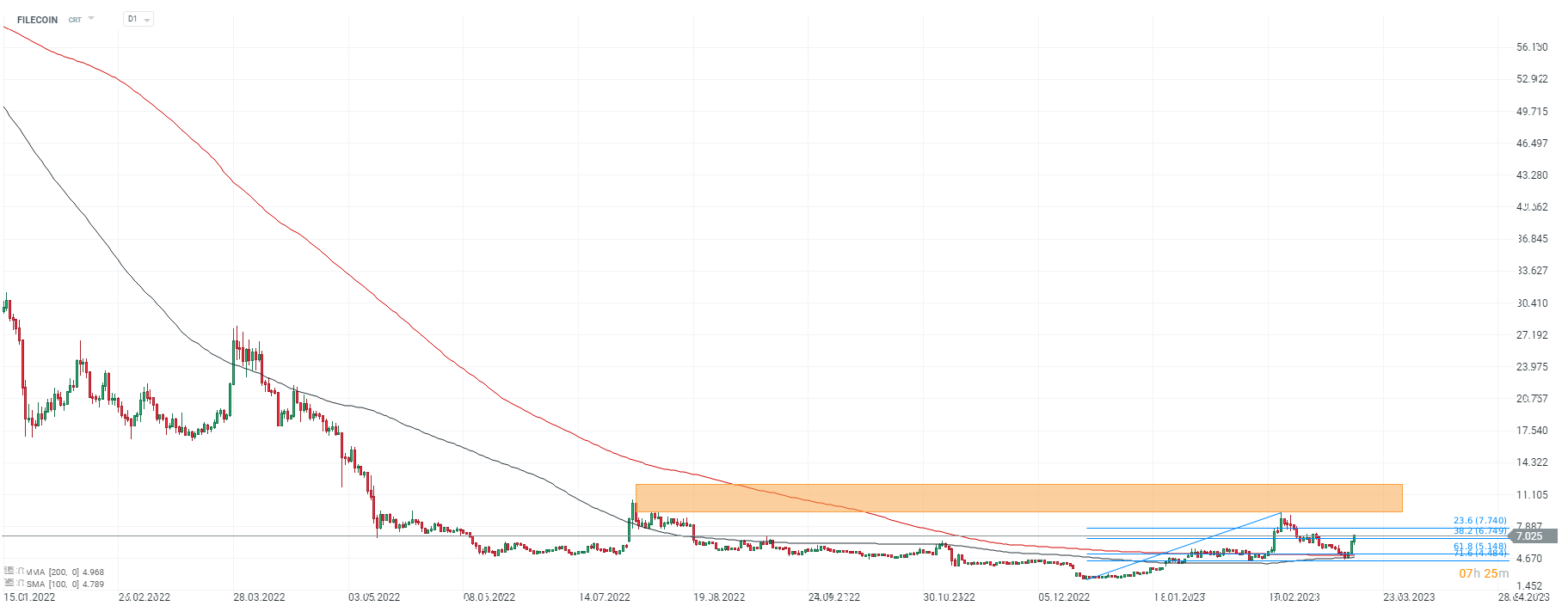 Filecoin, interwał D1. Cena wspina się w okolice lokalnych szczytów z końcówki lutego. Kluczowa strefa opory zdaje się znajdować między 8 a 12 USD i jest wyznaczona przez poprzednie reakcje cenowe, w tym szczyty z lata 2022 roku. Jeśli opór zostanie pokonany, a cena BTC będzie rosła, dla Filecoina może zostać otwarta droga nawet do 26 USD tj. szczytów z marca 2023 roku. Źródło; xStation5