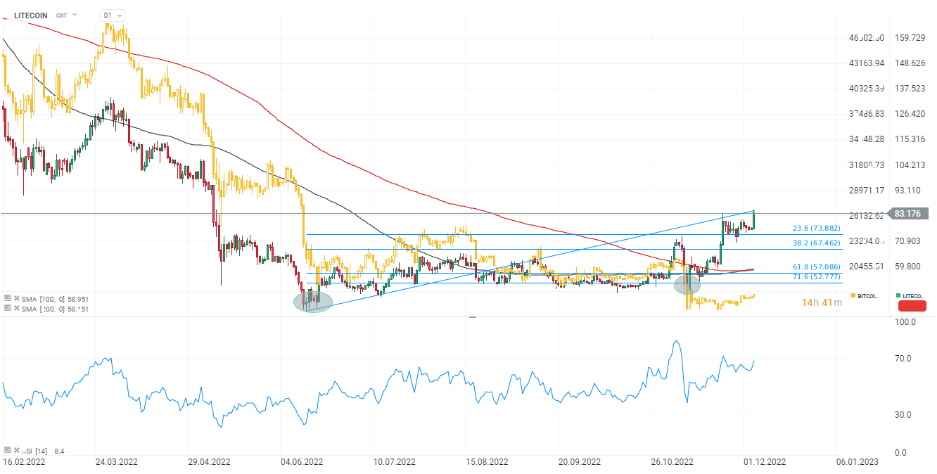 Wykres Litecoina, interwał D1. Kryptowaluta wspięła się na poziomy widziane ostatnio w kwietniu tego roku i widzimy, że po bankructwie FTX radzi sobie zdecydowanie lepiej od samego Bitcoina (żółty wykres). Obserwując 100 i 200 sesyjną średnią widzimy, że niedawno miało miejsce ich bycze przecięcie tzw. 'złoty krzyż' sygnalizując potencjalnie trwalsze odwrócenie trendu.Patrząc na formację utworodzną przez LTC w 2022 roku widzimy też podobieństwo do formacji spodka. Potencjalnie najbliższymi poziomami wsparcia jest 23.6 zniesienie Fibonacciego w okolicach 73 USD. Źródło: xStation5
