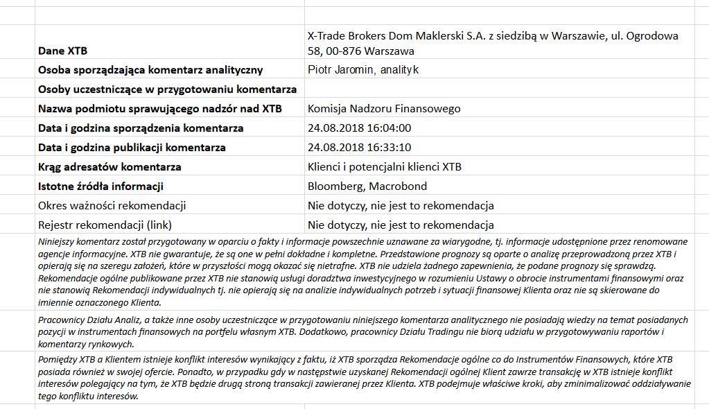 Ta publikacja handlowa jest informacyjna i edukacyjna. Nie jest rekomendacją inwestycyjną ani informacją rekomendującą lub sugerującą strategię inwestycyjną. W materiale nie sugerujemy żadnej strategii inwestycyjnej ani nie świadczymy usługi doradztwa inwestycyjnego. Materiał nie uwzględnia indywidualnej sytuacji finansowej, potrzeb i celów inwestycyjnych klienta. Nie jest też ofertą sprzedaży ani subskrypcji. Nie jest zaproszeniem do nabycia, reklamą ani promocją jakichkolwiek instrumentów finansowych. Publikację handlową przygotowaliśmy starannie i obiektywnie. Przedstawiamy stan faktyczny znany autorom w chwili tworzenia dokumentu. Nie umieszczamy w nim żadnych elementów oceniających. Informacje i badania oparte na historycznych danych lub wynikach oraz prognozy nie stanowią pewnego wskaźnika na przyszłość. Nie odpowiadamy za Twoje działania lub zaniechania, zwłaszcza za to, że zdecydujesz się nabyć lub zbyć instrumenty finansowe na podstawie informacji z tej publikacji handlowej. Nie odpowiadamy też za szkody, które mogą wynikać z bezpośredniego czy też pośredniego wykorzystania tych informacji. Inwestowanie jest ryzykowne. Inwestuj odpowiedzialnie.