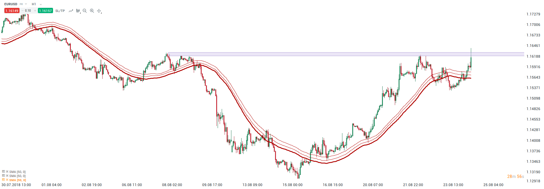 O godz. 16:00 swoje przemówienie w Jackson Hole rozpoczął Jerome Powell, który rozpoczął dość gołębio. Powell silnie zaakcentował, że kolejne podwyżki będą mocno uwarunkowane danymi makroekonomicznymi - jeśli płace i rynek pracy dalej będą rosły. Można spekulować na temat tego, czy ostatnie sugestie medialne Donalda Trumpa podziałały na Jerome Powella, który troszkę obniżył swój jastrzębi ton. EURUSD po jego wypowiedziach rośnie i kurs wychodzi znacząco powyżej 1,1600. W tym miejscu znajdują się ostatnie maksima oraz szczyty z początku sierpnia. Na wykresie możemy zaobserwować, że wahania cen z ostatnich dwóch tygodni układają się w potencjalną formację odwróconej głowy z ramionami.