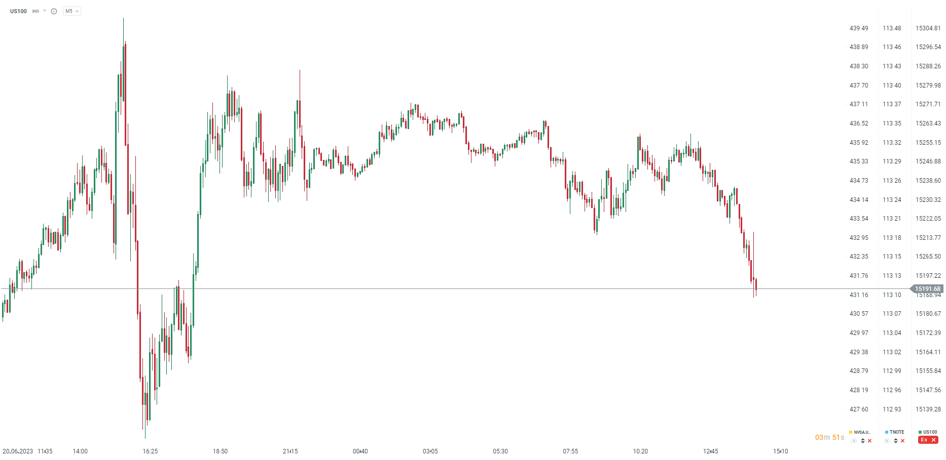US100 cofa się po publikacji tekstu wypowiedzi Powella. Wystąpienie o godzinie 16:00. Źródło: xStation5