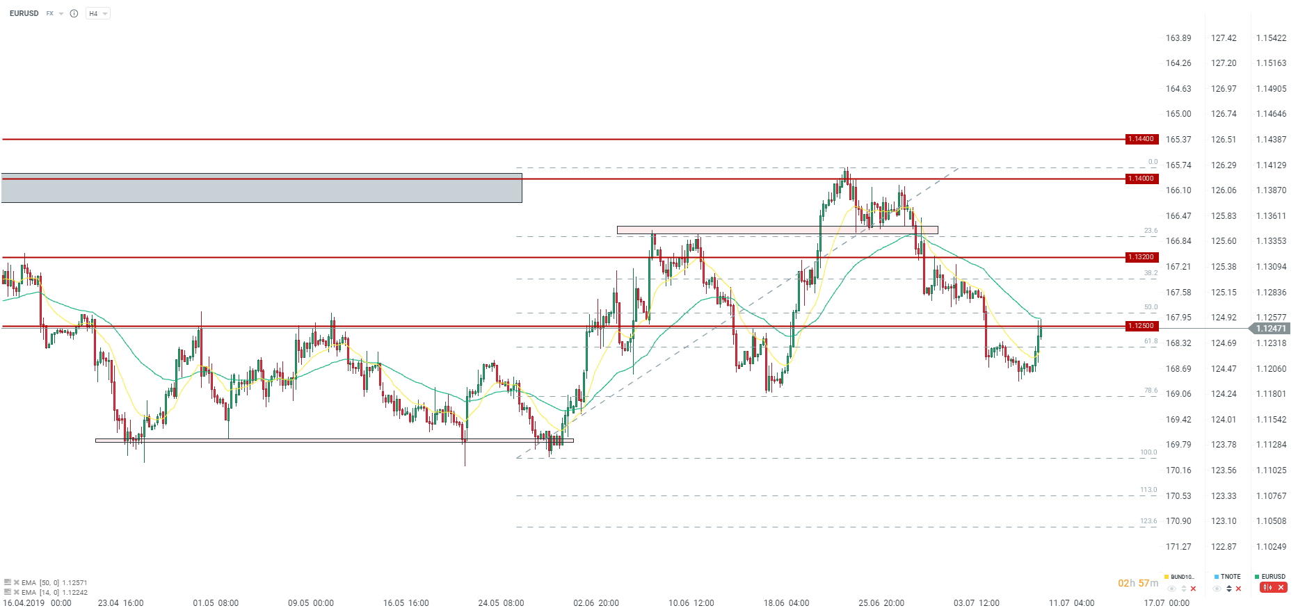 EURUSD kolejny raz testuje 50 okresową średnią oraz kolice poziomu 1,1250 wraz ze zniesieniem 50.0. Stałe przełamanie wskazanych poziomów mogłoby oznaczać wyłamanie z obecnej spadkowej fali, która rozpoczęła się pod koniec czerwca. Źródło: xStation5
