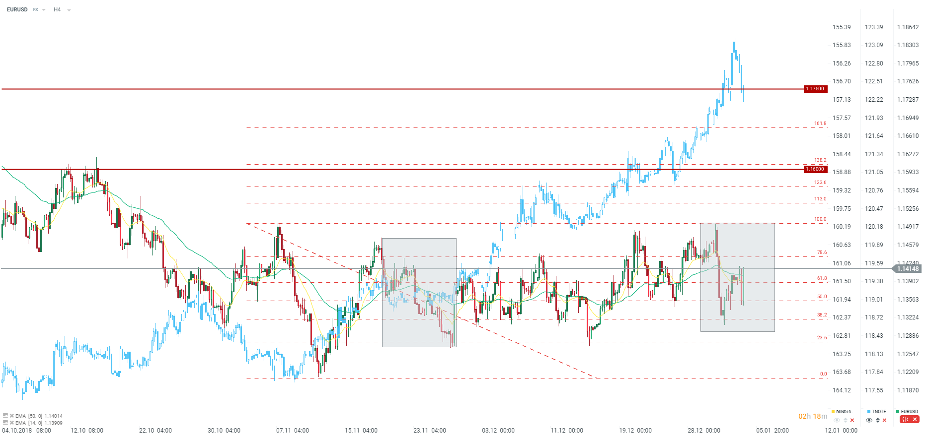 Komentarze te pochodzą z jego przygotowanej przemowy. W szczególności gołębio brzmią dwie ostatnie uwagi. Powell dodaje później, że spotyka się z prezydentem USA, tak jak spotykali się inni szefowie i nie zamierza ustąpić ze swojego stanowiska w przypadku takiej prośby ze strony Trumpa. Oprócz tego Powell wskazuje, że Fed będzie transparentny jak to tylko możliwe. Dolar w odpowiedzi oddaje wcześniejsze zyski wypracowane po publikacji raportu z amerykańskiego rynku pracy. Niemniej EURUSD pozostaje w konsolidacji.