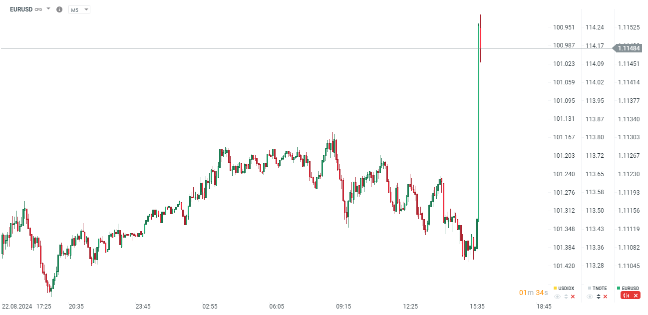 Rynek wycenia obecnie ok. 33% szansy na 50 pb cięcia we wrześniu i w pełni wycenia 100 pb w 2024 roku. Ruch na rynku na pierwsze słowa jest wyraźny, ale ograniczony: ok. 40-50 pipsów w górę na EURUSD, ok. 25 punktów w górę na US500 oraz ok. 20 USD na złocie. US500 oraz złoto testują wczorajsze lokalne szczyty.