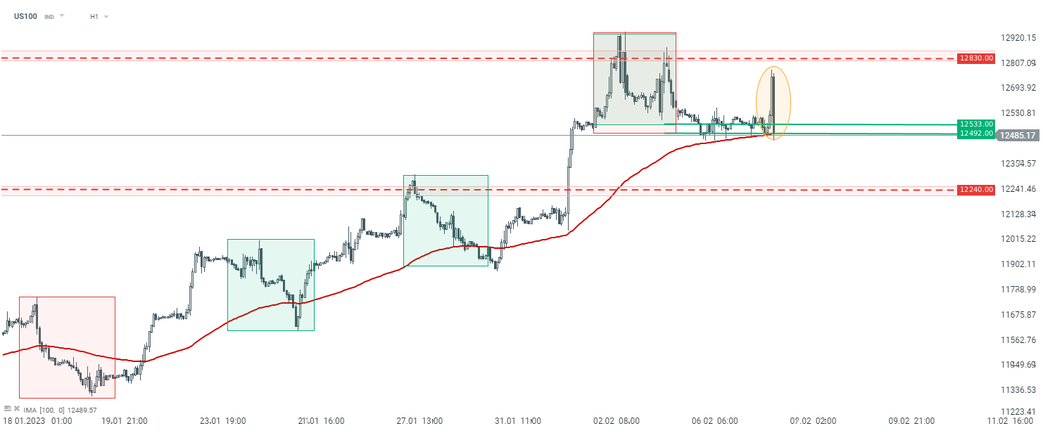 US100 początkowo ruszył w górę po komentarzach Powella. Niemniej szybko doszło do zwrotu, przez co notowania znalazły się na sesyjnych minimach. Aktualnie kurs US100 testuje wsparcie wynikające z geometrii 1:1 i średniej EMA100. Źródło: xStation5