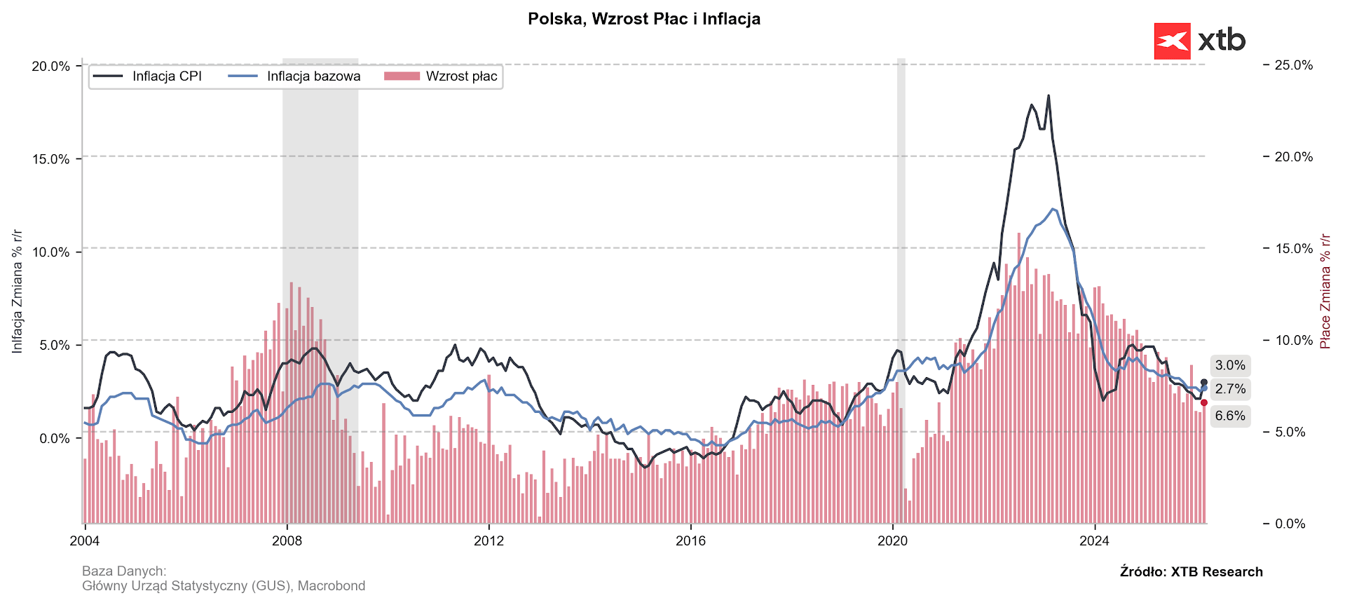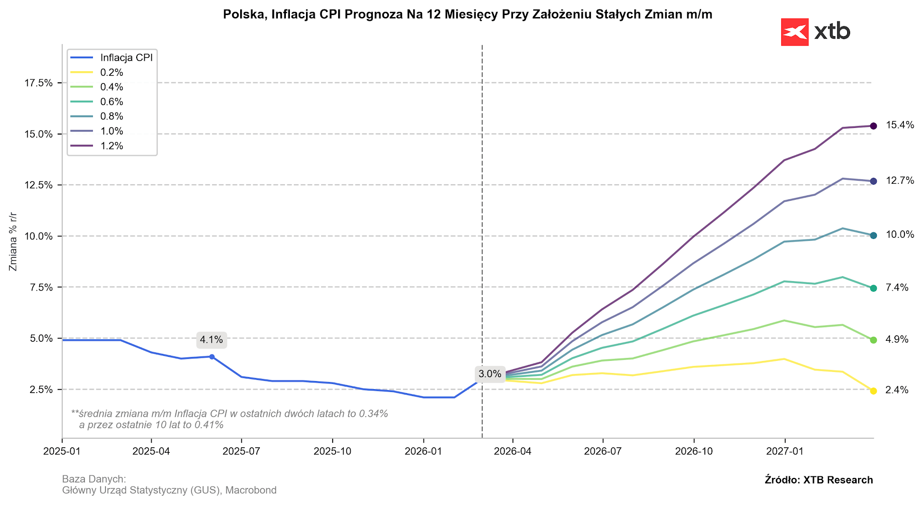 - Ryzyka fiskalne: Zarzecki wskazuje, że w średnim i długim terminie to czynniki krajowe mogą być groźniejsze dla cen niż sam konflikt na Bliskim Wschodzie. Chodzi głównie o akomodacyjną politykę fiskalną rządu.