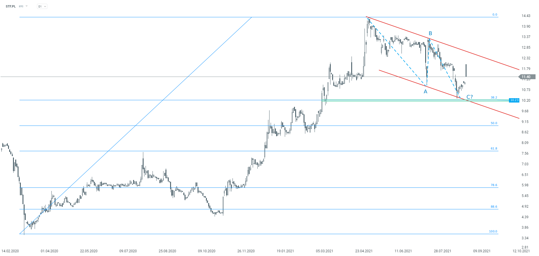 Inwestorzy pozytywnie przyjęli opublikowane dane, przez co po rozpoczęciu handlu mogliśmy obserwować sporą lukę cenową sięgającą nawet 8%. Aktualnie ruch został co prawda ograniczony do +3%, niemniej sentyment w długim terminie wydaje się pozostawać pozytywny. Patrząc na interwał D1, notowania STF odbiły się w ostatnim czasie od wsparcia wynikającego z mierzenia 38,2% fali wzrostowej rozpoczętej marcu ubiegłego roku. Ponadto ostatni ruch spadkowy ma strukturę trójfalową, co zgodnie z teorią Fal Elliotta może przypominać korektę ABC i zapowiadać jej zakończenie. Niemniej potwierdzeniem takiego scenariusza byłoby dopiero wybicie z lokalnego kanału spadkowego, oznaczonego kolorem czerwonym.