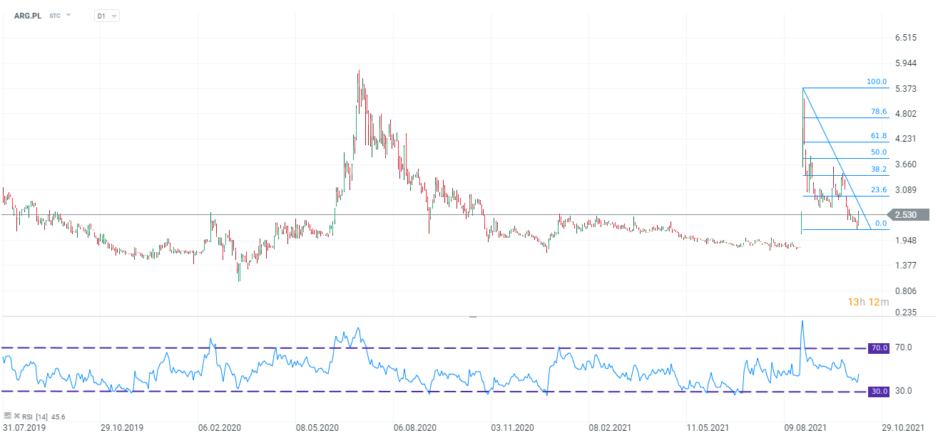 Patrząc na akcje spółki z technicznego punktu widzenia, w kolejnych dniach kluczowe będzie czy uda się przebić trend spadkowy nakreślony przez lokalne szczyty z 25 sierpnia i 30 września. Szczyt z 30 września zbiega się dodatkowo z zniesieniem 38,2% Fibonacciego, więc poziom 3,40 zł za akcję wydaje się kluczowym oporem dla wyjścia z trendu spadkowego.