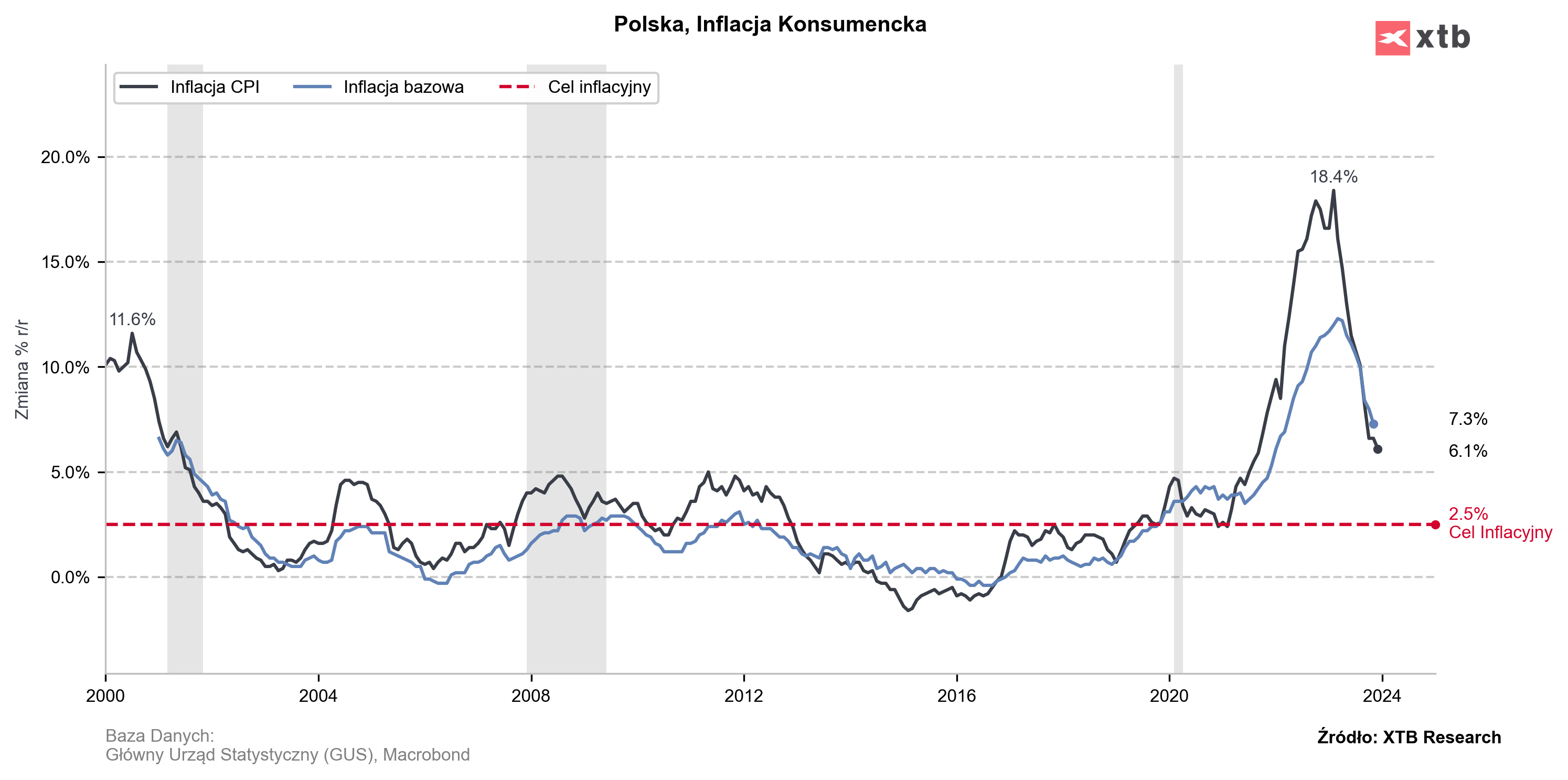 W grudniu 2023 inflacja CPI (odczyt wstępny) wyniosła 6,1% r/r (prognoza: 6,5%; poprzednio: 6,6%) W grudniu w stosunku do listopada ceny w Polsce wzrosły o 0,1% (prognozowano: 0,3%). Dane zaskoczyły inwestorów znacznie niższym od oczekiwań wskazaniem. Kluczowym może być teraz sposób, w jaki na dane będą reagowali bankierzy RPP. Przypomnijmy, że Rada wielokrotnie nadmieniała, że w sprawie kolejnych decyzji dotyczących stóp procentowych kluczowe będę nowe prognozy makroekonomiczne, które poznamy w marcu.
