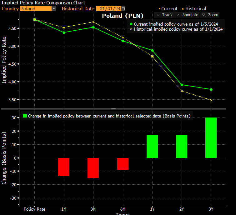 Od początku 2024 roku do dzisiaj (odczytu CPI) wycena rynku pieniężnego wskazuje na szybsze tempo obniżek stóp procentowych w Polsce.