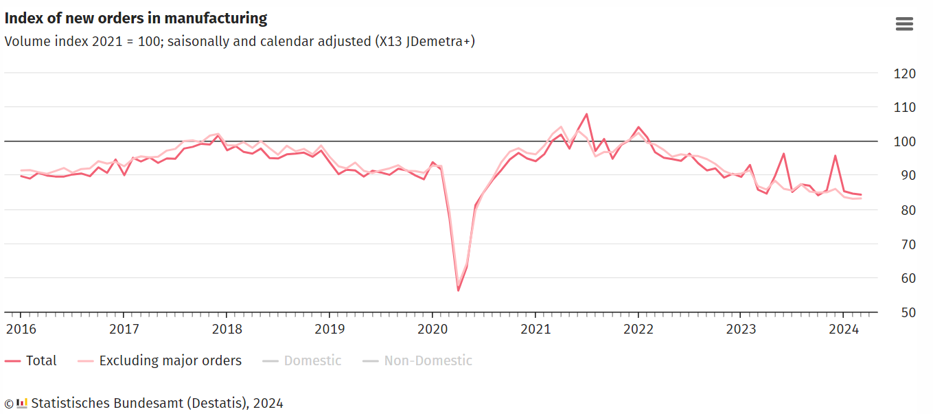 W ramach przemysłu przetwórczego w marcu 2024 r. w poszczególnych sektorach gospodarki można było zaobserwować silnie przeciwstawne trendy - podaje niemiecki urząd. W sektorze „produkcji pozostałego sprzętu transportowego” (samoloty, statki, pociągi) nowe zamówienia spadły o 2,3% miesiąc do miesiąca po korekcie sezonowej i kalendarzowej. Spadek nowych zamówień w produkcji metalowych wyrobów gotowych (-4,5%) również wpłynął na pogorszenie ogólnych wyników. Z kolei wzrost nowych zamówień odnotowany w przemyśle motoryzacyjnym (+1,1%) i produkcji sprzętu elektrycznego (+5,9%) miał pozytywny wpływ na ogólne wyniki.