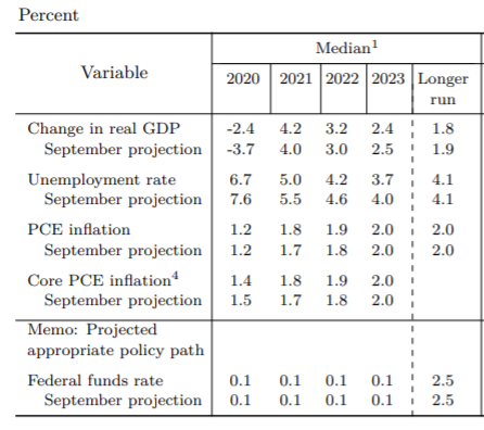 Po zakończonym właśnie posiedzeniu Fed zaprezentował nowe projekcje makroekonomiczne. W porównaniu do wrześniowych prognoz, amerykański bank centralny spodziewa się obecnie płytszej recesji w 2020 roku (-2,4% zamiast -3,7%). Odbicie gospodarcze w 2021 i 2022 roku powinno być z kolei nieznacznie mocniejsze.