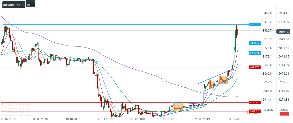 Bitcoin w okolicach kluczowego poziomu 8000 USD. Źródło: xStation5