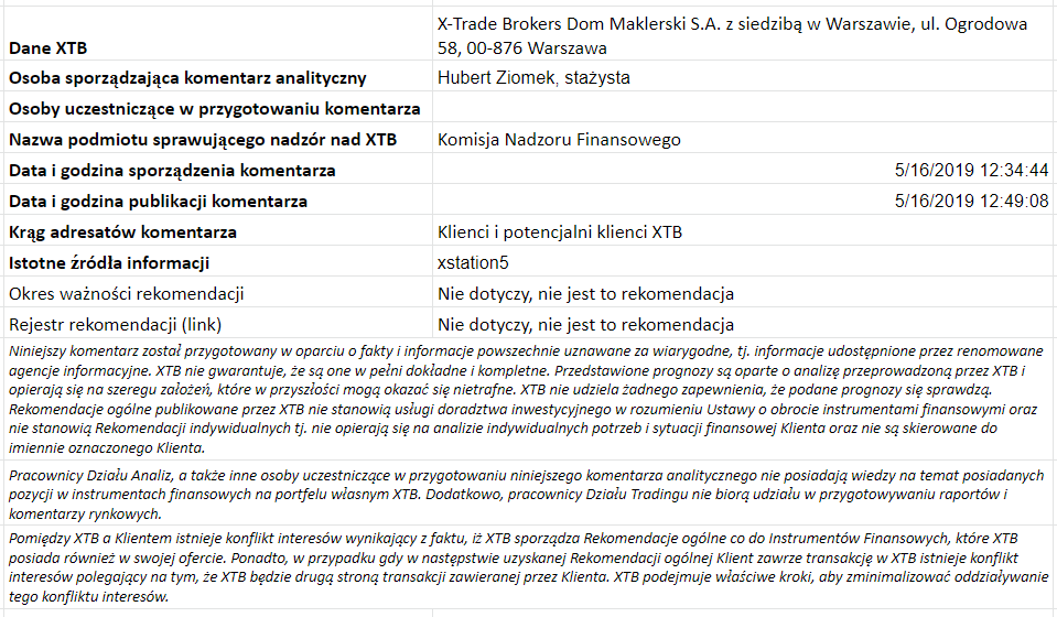 Ta publikacja handlowa jest informacyjna i edukacyjna. Nie jest rekomendacją inwestycyjną ani informacją rekomendującą lub sugerującą strategię inwestycyjną. W materiale nie sugerujemy żadnej strategii inwestycyjnej ani nie świadczymy usługi doradztwa inwestycyjnego. Materiał nie uwzględnia indywidualnej sytuacji finansowej, potrzeb i celów inwestycyjnych klienta. Nie jest też ofertą sprzedaży ani subskrypcji. Nie jest zaproszeniem do nabycia, reklamą ani promocją jakichkolwiek instrumentów finansowych. Publikację handlową przygotowaliśmy starannie i obiektywnie. Przedstawiamy stan faktyczny znany autorom w chwili tworzenia dokumentu. Nie umieszczamy w nim żadnych elementów oceniających. Informacje i badania oparte na historycznych danych lub wynikach oraz prognozy nie stanowią pewnego wskaźnika na przyszłość. Nie odpowiadamy za Twoje działania lub zaniechania, zwłaszcza za to, że zdecydujesz się nabyć lub zbyć instrumenty finansowe na podstawie informacji z tej publikacji handlowej. Nie odpowiadamy też za szkody, które mogą wynikać z bezpośredniego czy też pośredniego wykorzystania tych informacji. Inwestowanie jest ryzykowne. Inwestuj odpowiedzialnie.