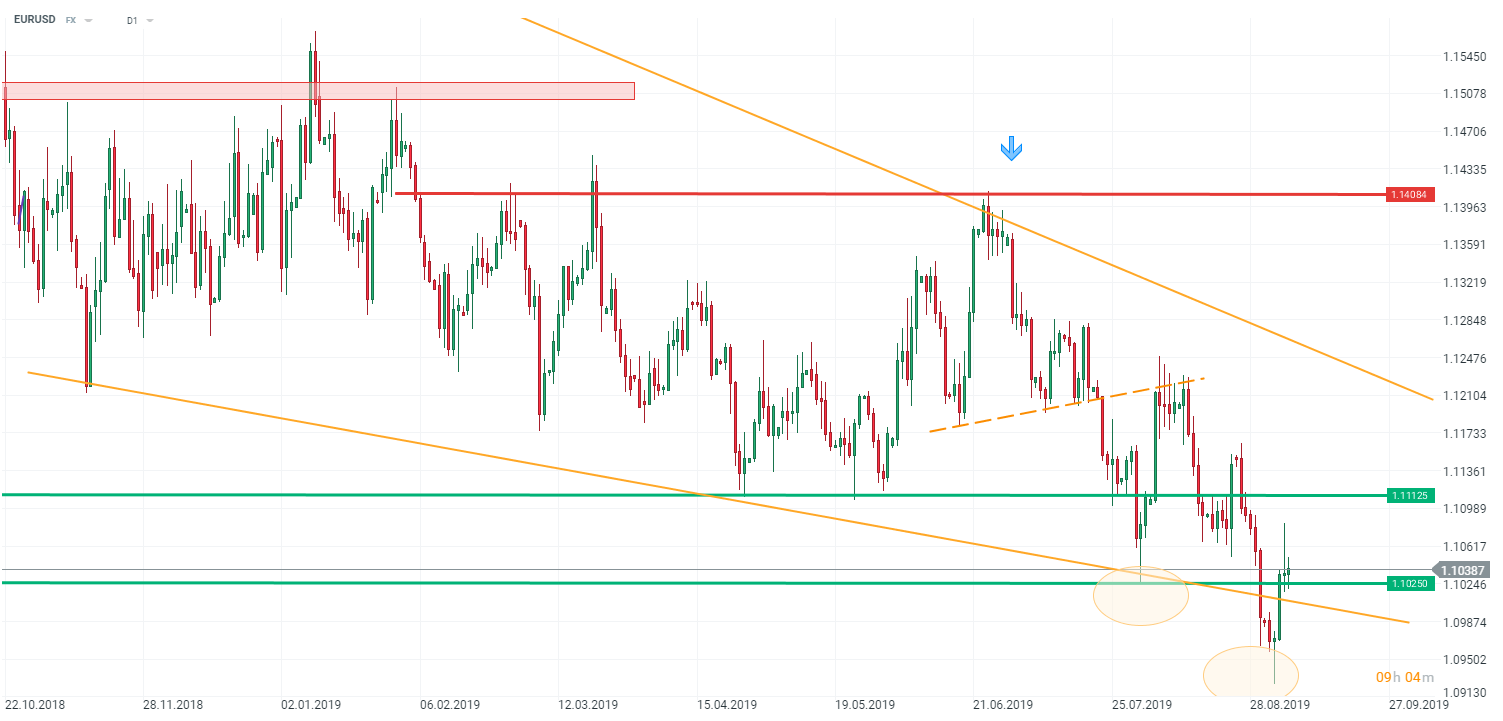 W Europie pojawiła się nadzieja po tym jak indeksy PMI za sierpień pokazały poprawę, szczególnie w sektorze usług. Niemniej niemiecki przemysł - głównym powód spowolnienia w Europie - pozostaje słaby. Niemiecki PMI dla sektora przemysłowego był jednym z niewielu, który nie pokazał znaczącej poprawy, a zarówno dane o zamówienia (-5,6% r/r), jak i o produkcji (-4,2% r/r) były gorsze od oczekiwań. W przyszłym tygodniu EBC podejmie decyzję w jakim stopniu luzować politykę pieniężną. Wygląda na to, że obniżka stóp jest pewna, jednak wznowienie programu luzowania ilościowego może zostać odłożone do czasu kiedy stery przejmie Christine Lagarde. W takim scenariuszu euro mogłoby zyskać, czego nie można powiedzieć o indeksach.