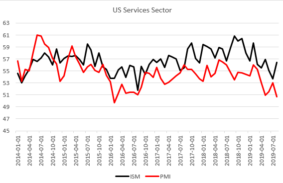 Cofnięcie się przemysłowego indeksu ISM poniżej poziomu 50 pkt po raz pierwszy od 2016 roku pokazał, że amerykański przemysł zaczął odczuwać skutki globalnego spowolnienia. Niemniej gospodarka ogólnie nie radzi sobie aż tak źle. Indeks ISM dla sektora usług wzrósł do poziomu 56,4 pkt, co było odczytem sprzecznym z indeksem PMI firmy Markit. Dane z rynku pracy również były mieszane: raport NFP pokazał wzrost o 130 tys. etatów i nie potwierdził wzrostu sygnalizowanego przez raport ADP. Z drugiej jednak strony, płac utrzymały wysokie tempo wzrostu - 3,2% r/r. Paczka mieszanych danych pewnie pogłębi podziały wśród członków Fed, ale słaby odczyt NFP i ISM dla przemysłu powinien być wystarczającym powodem dla kolejnej obniżki stóp.