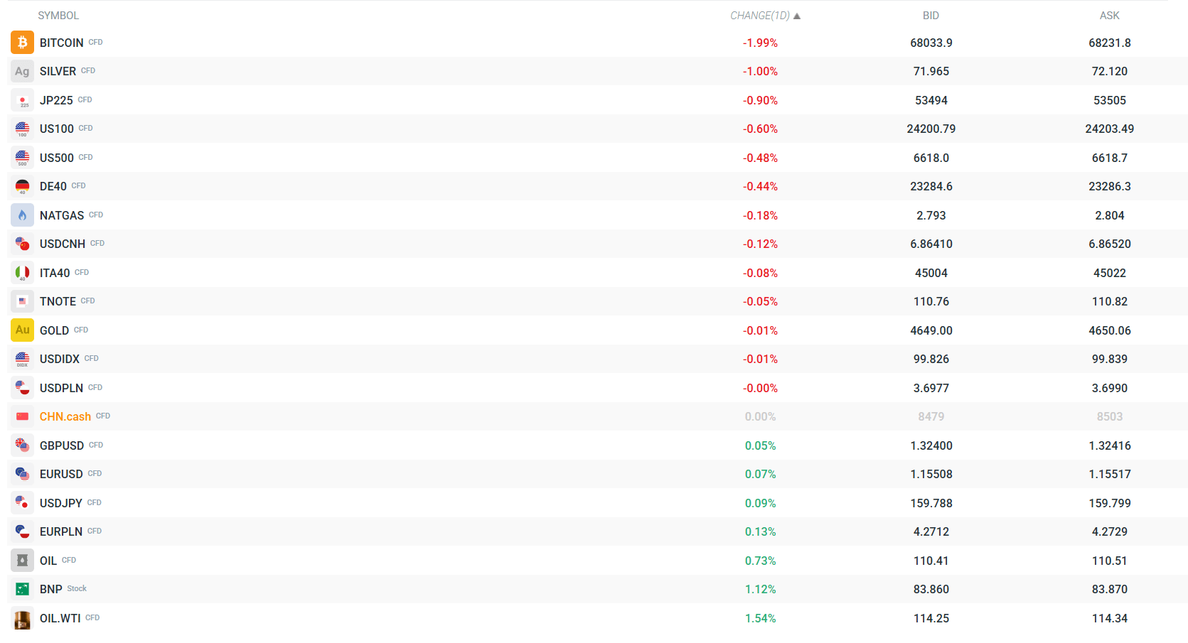 Na indeksach widzimy raczej konsolidację niż paniczną wyprzedaż: DE40 rośnie o ok. 0,5%, US500 i US100 dodają po 0,07–0,08%, a włoski ITA40 zyskuje ponad 0,7%.