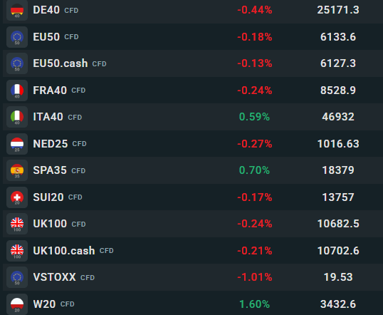 Główne europejskie indeksy znajdują się pod presją – Euro Stoxx 50 (EU50) traci około 0,20%, a niemiecki DAX spada o około 0,44%, co odzwierciedla jego dużą ekspozycję na handel międzynarodowy. Francuski FRE40 chwilowo osiągnął nowe historyczne maksimum, po czym zaczął tracić (obecnie -0,25%). Brytyjski UK100 traci 0,25%. Szeroki indeks Stoxx 600 spada o około 0,30%, przy czym większość sektorów znajduje się pod kreską. Wśród najsłabszych są spółki przemysłowe wrażliwe na handel zagraniczny.