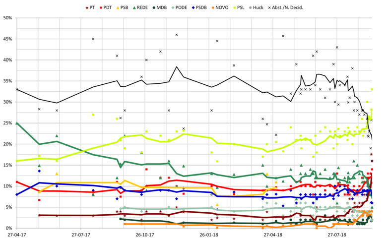 Jasno zielona linia – Bolsonaro, czarna linia – Lula da Silva, ciemno czerwona linia – Haddad, czerwona linia – Gomes, niebieska linia – Alckmin. Najbardziej prorynkowy kandydat to ten ostatni, niemniej Bolsonaro ma obecnie duże szanse wygarania ze względu na swoje mocno prawicowe usposobienie. Traktowany jest przez rynek jako mniejsze zło w porównaniu do lewicowych kandydatów. Źródło: Wikipedia