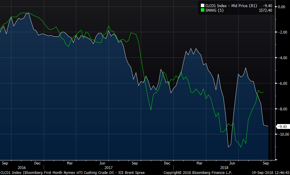 Spread pomiędzy ropą WTI oraz ropą Brent (biała linia) sugeruje, że może pojawić się większy popyt na ropę WTI (eksport, średnia 4 tygodniowa – zielona linia, odwrócona oś). Źródło: Bloomberg