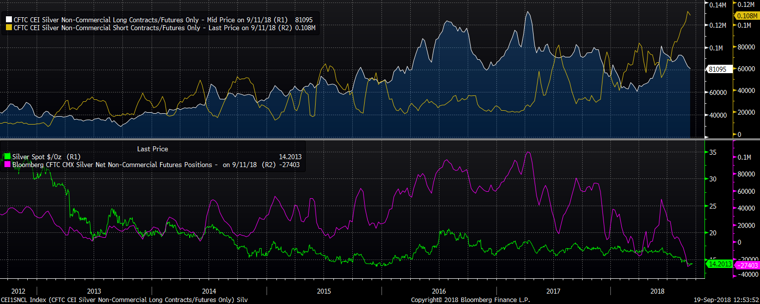 Pozycjonowanie netto na srebrze jest najniższe w historii, wyraźnie poniżej 0. Krótkie kontrakty wykazują potencjalny punkt przegięcia. Źródło: Bloomberg
