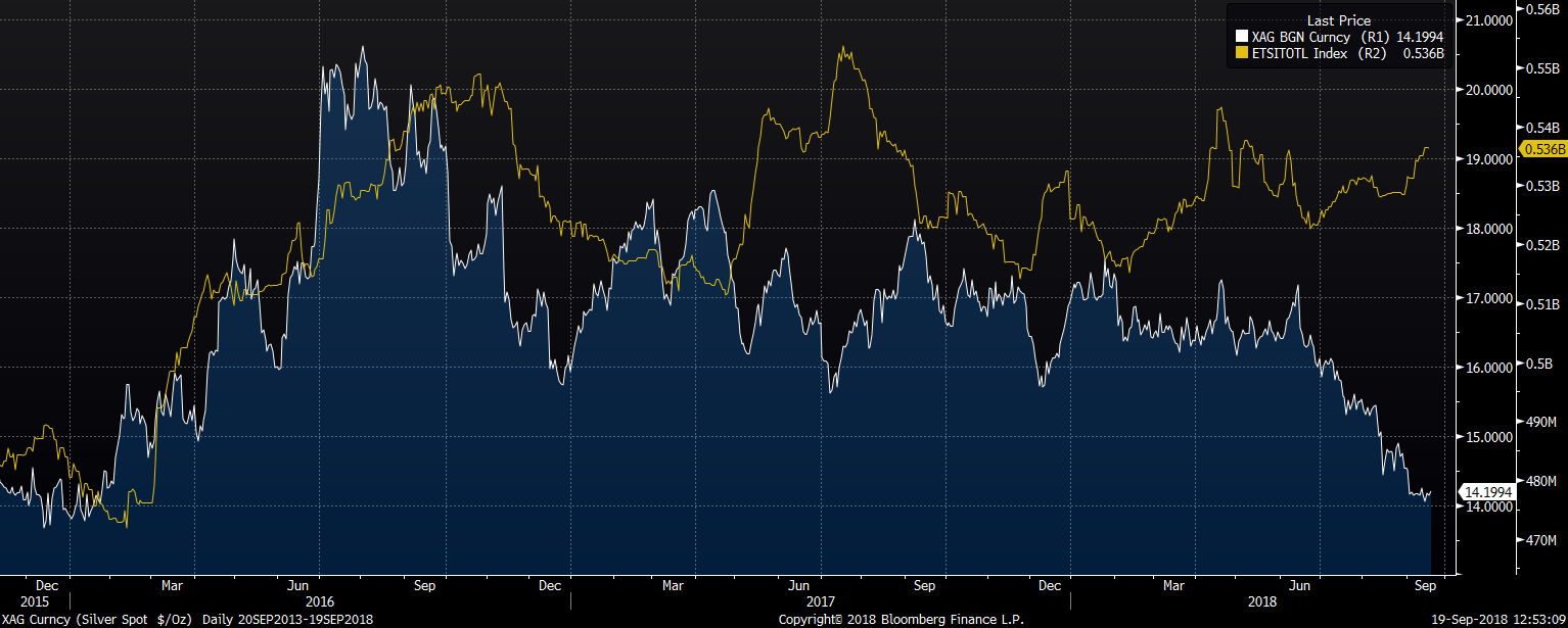 Srebro znajduje się nisko, co zwiększa popyt ze strony ETF-ów. Źródło: Bloomberg