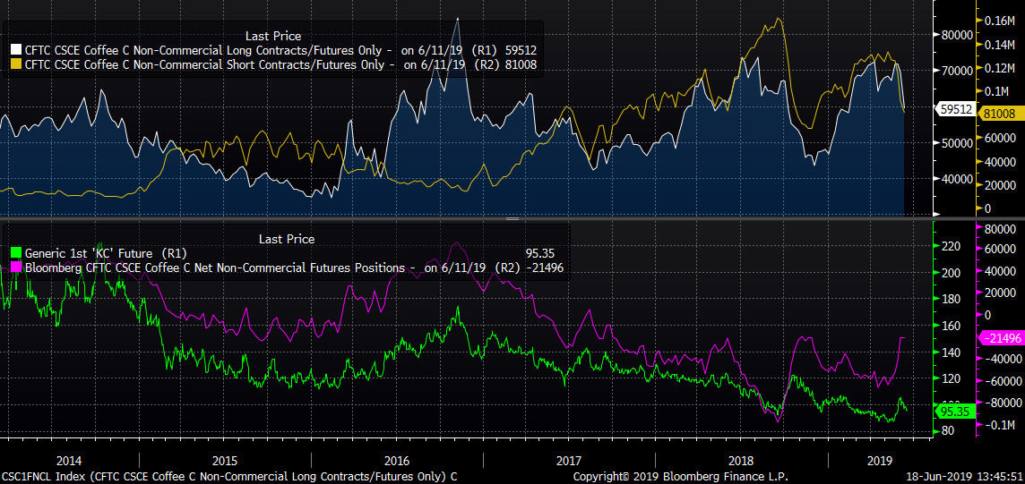Brak dywergencji między pozycjami krótkimi oraz pozycjami długimi powoduje, że brak jest sygnału odbicia na kawie. Źródło: Bloomberg