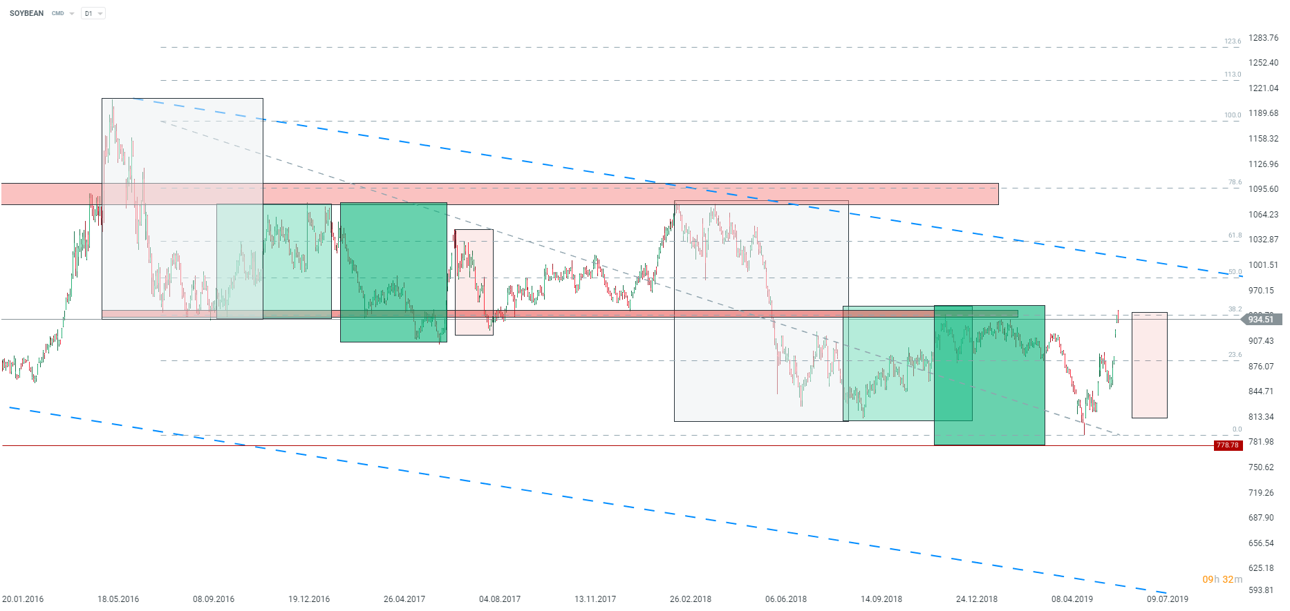 Cena soi cofa się w odpowiedzi na pozytywne dane dotyczące zasiewów. Soja cofa się z kluczowej strefy podażowej, która obecna była przede wszystkim na przełomie 2018 oraz 2019 roku oraz wynikała z wcześniejszej strefy wsparcia w latach 2016-2017. Źródło: xStation5