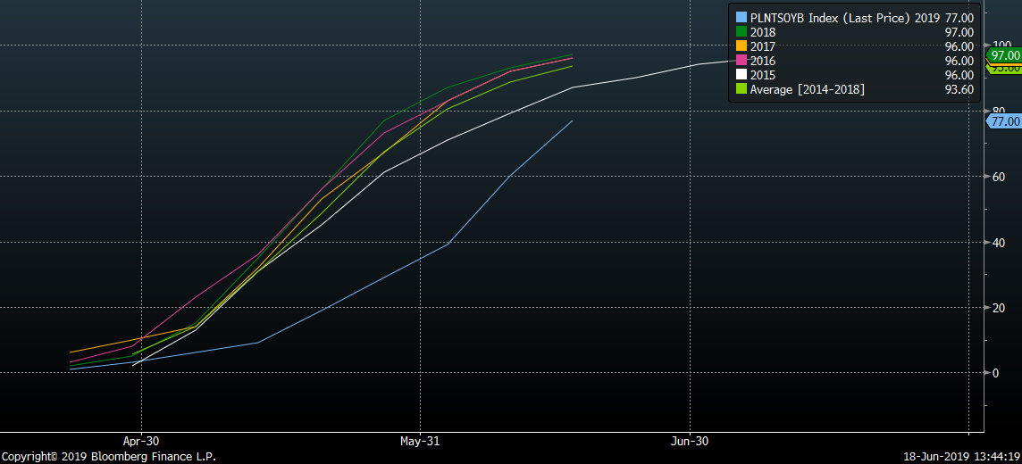 Stan zasiewów soi w USA jest w dalszym ciągu niższy niż w poprzednich sezonach, ale widać znaczne przyśpieszenie w przeciągu ostatnich dwóch tygodni. Źródło: Bloomberg