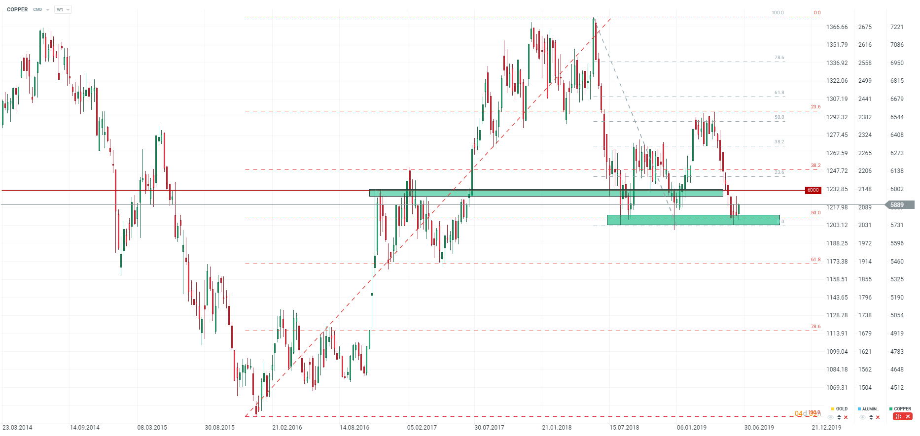 Miedź odbija od ważnej strefy wsparcia przy zniesieniu 50.0 ostatniej dużej fali wzrostowej. Pierwszy cel dla byków to okolice 6000 USD za tonę, a następnie strefa związana ze zniesieniem 38.2 wspomnianej fali oraz zniesieniem 23.6 cofnięcia z połowy zeszłego roku. Źródło: xStation5