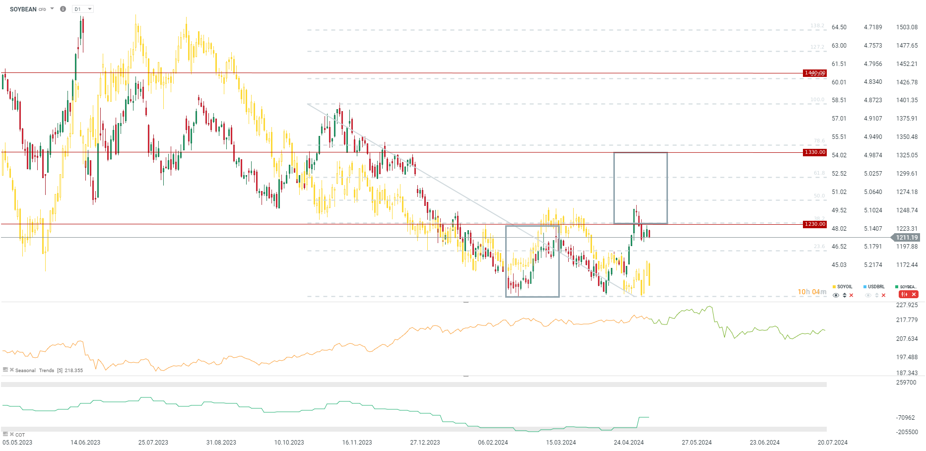 Olej sojowy bardzo mocno odbił na końcu poprzedniego oraz na początku obecnego tygodnia. Z drugiej strony ceny oleju wciąż są relatywnie niżej niż cena samej soi. Co więcej, soja nie kontynuowała ostatniego wybicia poziomu 1230 centów za buszel, który był jednocześnie traktowany jako linia szyi formacji podwójnego dołka. Źródło: xStation5