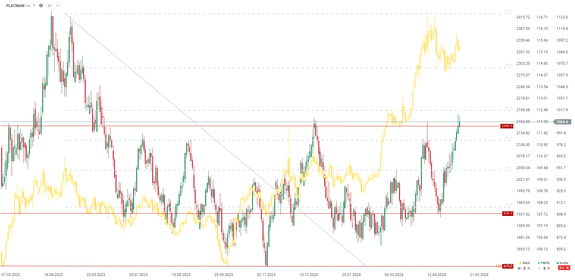 - Platyna przekroczyła poziom 1000 USD i znalazła się najwyżej od czerwca 2023 roku