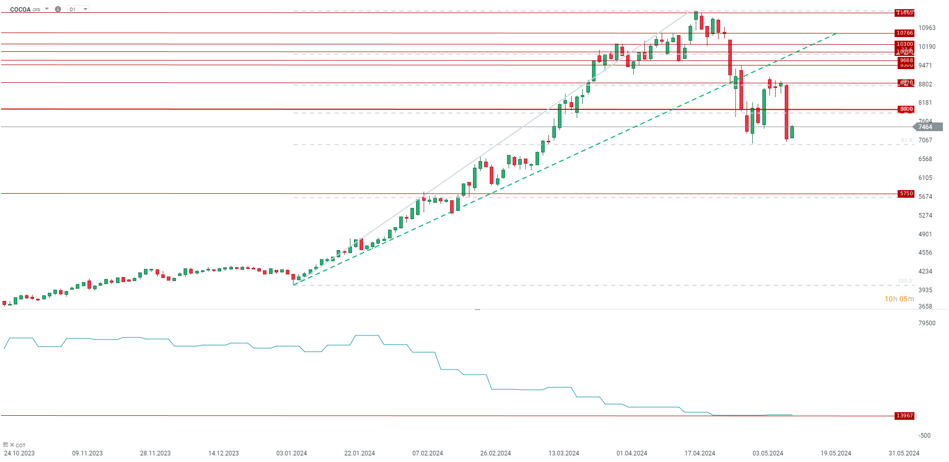 Kakao utrzymuje ważne wsparcie techniczne na poziomie 7000 USD oraz przy zniesieniu 61.8 ostatniej dużej fali wzrostowej. Z drugiej strony ruch wzrostowy we wtorek jest ograniczony (na moment sesji europejskiej), co może oznaczać brak paliwa do wzrostów. Jeśli dzisiejsza mała zmienność zostanie utrzymana, może to oznaczać faktyczny koniec ostatniej korekty wzrostowej w możliwym nowym trendzie spadkowym. Źródło: xStation5