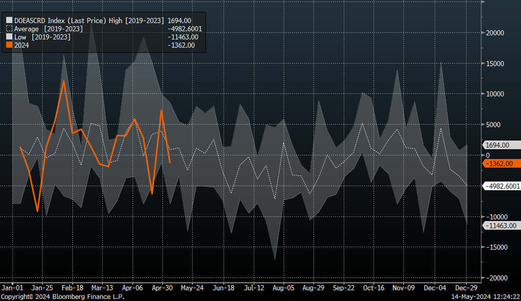 - Zapasy ropy w USA spadły ostatnio, ale było to zgodne z sezonowością. Okres długotrwałego spadku zapasów rozpoczyna się mniej więcej w połowie czerwca i trwa nawet do połowy września. Zachowanie zapasów w kolejnych tygodniach może pokazać, czego oczekiwać po zapasach w okresie wakacyjnym