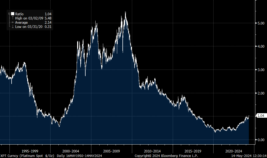 Stosunek cen platyny i palladu wyraźnie odbija od lokalnych dołków z lat 2020-2022. Kiedy stosunek tych cen odbijał poprzednio z podobnie niskich poziomów, cena platyny była nawet 4 krotnie wyższa niż cena palladu. Miało to miejsce podczas poprzedniej hossy na rynku metali szlachetnych. Warto zauważyć, że teraz przy wysokich cenach złota i srebra, cena platyny i palladu pozostaje ekstremalnie niska. Źródło: Bloomberg Finance LP, XTB