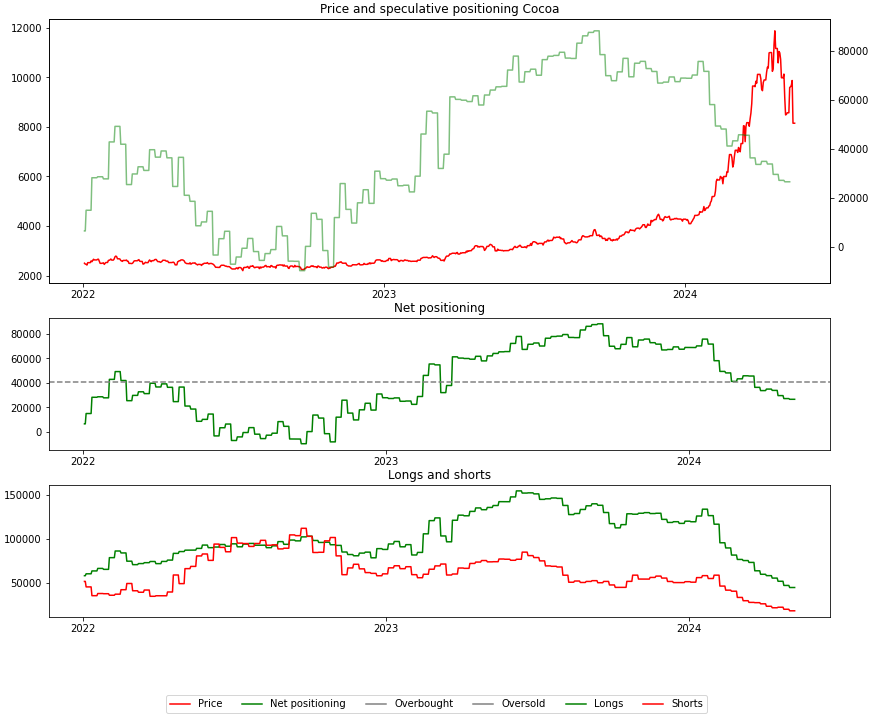 Na kakao obserwujemy dalszy spadek pozycji krótkich i długich. Zachowanie cen wskazuje na możliwe „pęknięcie” bańki i próbę dostosowania się do realiów, co może oznaczać spadek nawet do zakresu 4-6 tys. USD za tonę w kolejnych miesiącach. Z drugiej strony przy obecnej niskiej płynności nie można wykluczać ekstremalnych dziennych ruchów powyżej 10%. Źródło: Bloomberg Finance LP, XTB