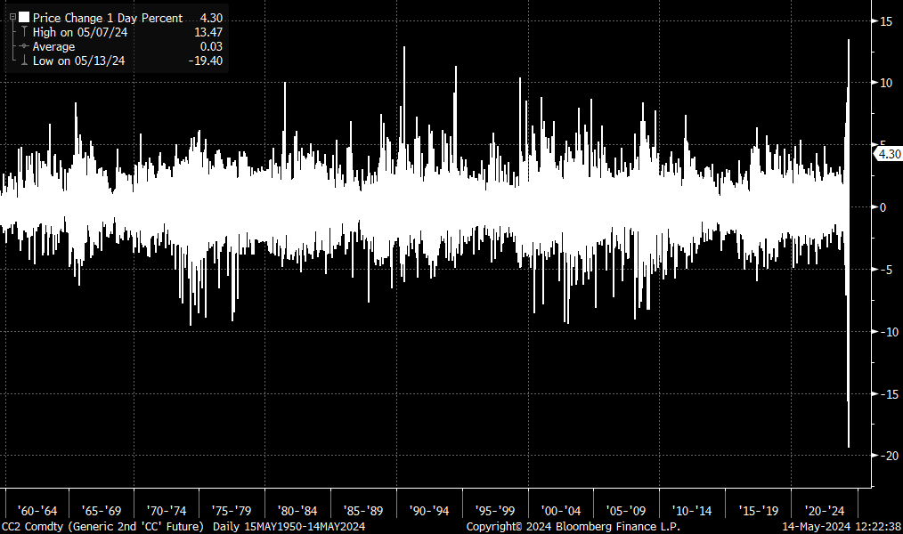 - Kakao jeszcze niedawno doświadczyło największego dziennego wzrostu w historii na poziomie ok. 15%, a za nami największy spadek w historii na poziomie ok. 19%.