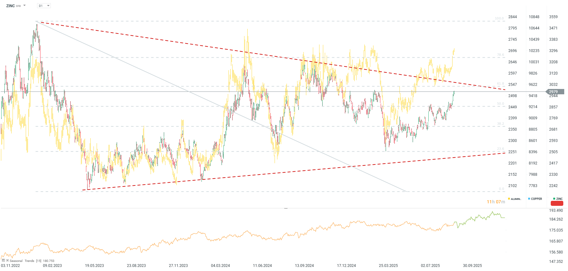 Ceny cynku zaliczają spore odbicie od kwietnia, ale w ujęciu rocznym pozostają bardzo blisko zamknięcia z 2024 roku. Trendy na rynku są podobne do tego, co prezentuje rynek miedzi czy aluminium. Pomimo niskich zapasów sytuacja fundamentalna wskazuje jednak na sporą nadpodaż, która może prowadzić do pewnego dostosowania w jakimś czasie. Cena zbliża się do ważnego oporu w okolicach 3000 USD za tonę, gdzie znajduje się spadkowa linia trendu oraz zniesienie 61.8 fali spadkowej z 2023 roku. Źródło: xStation5