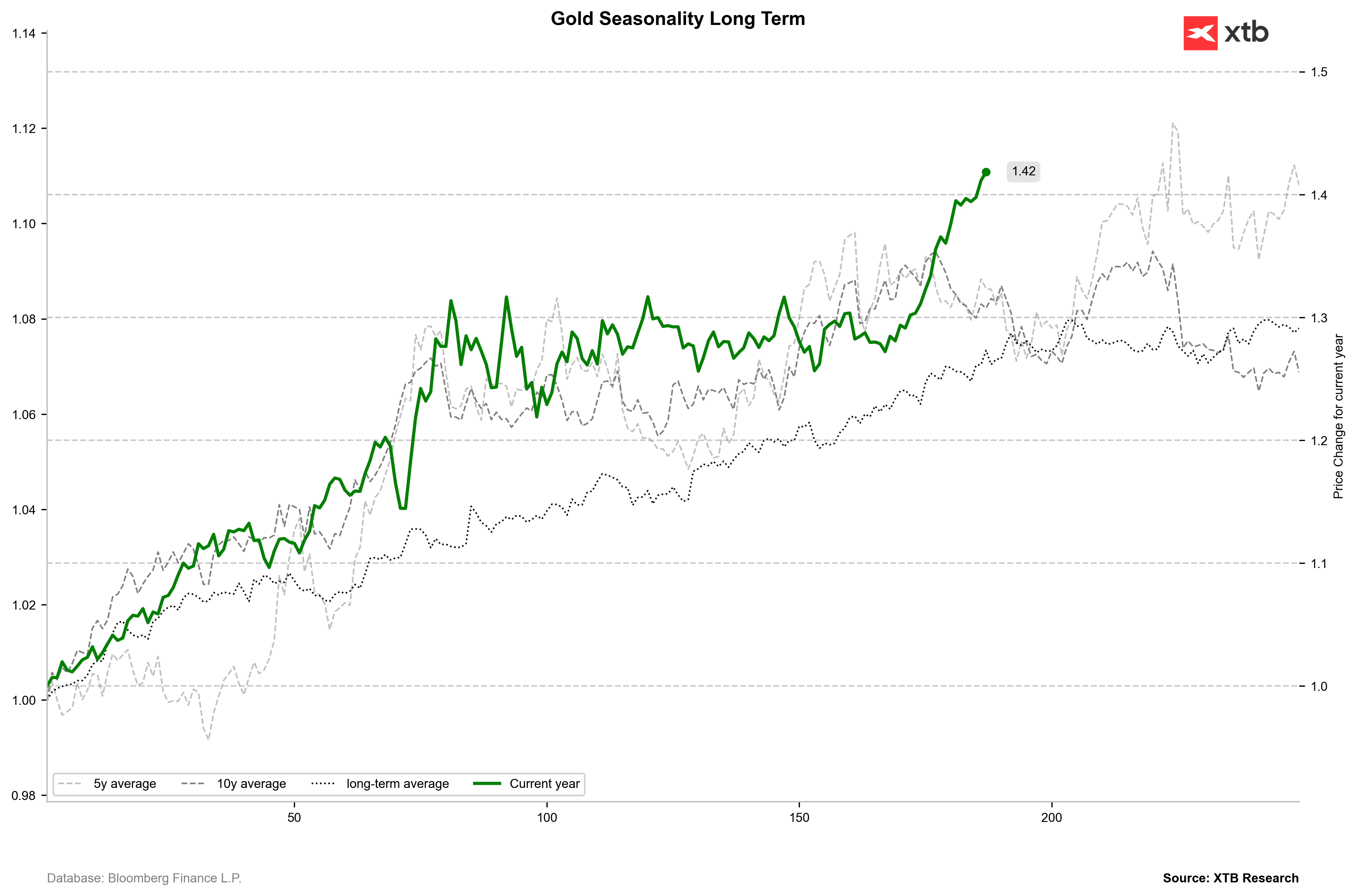 Sezonowość wskazuje, że lokalny dołek na złocie powinien mieć miejsce pod koniec września. Jeśli złoto faktycznie zaliczyłoby realizację zysków po Fed, to przełom września/października może być momentem kolejnego ożywienia. Źródło: Bloomberg Finance LP, XTB