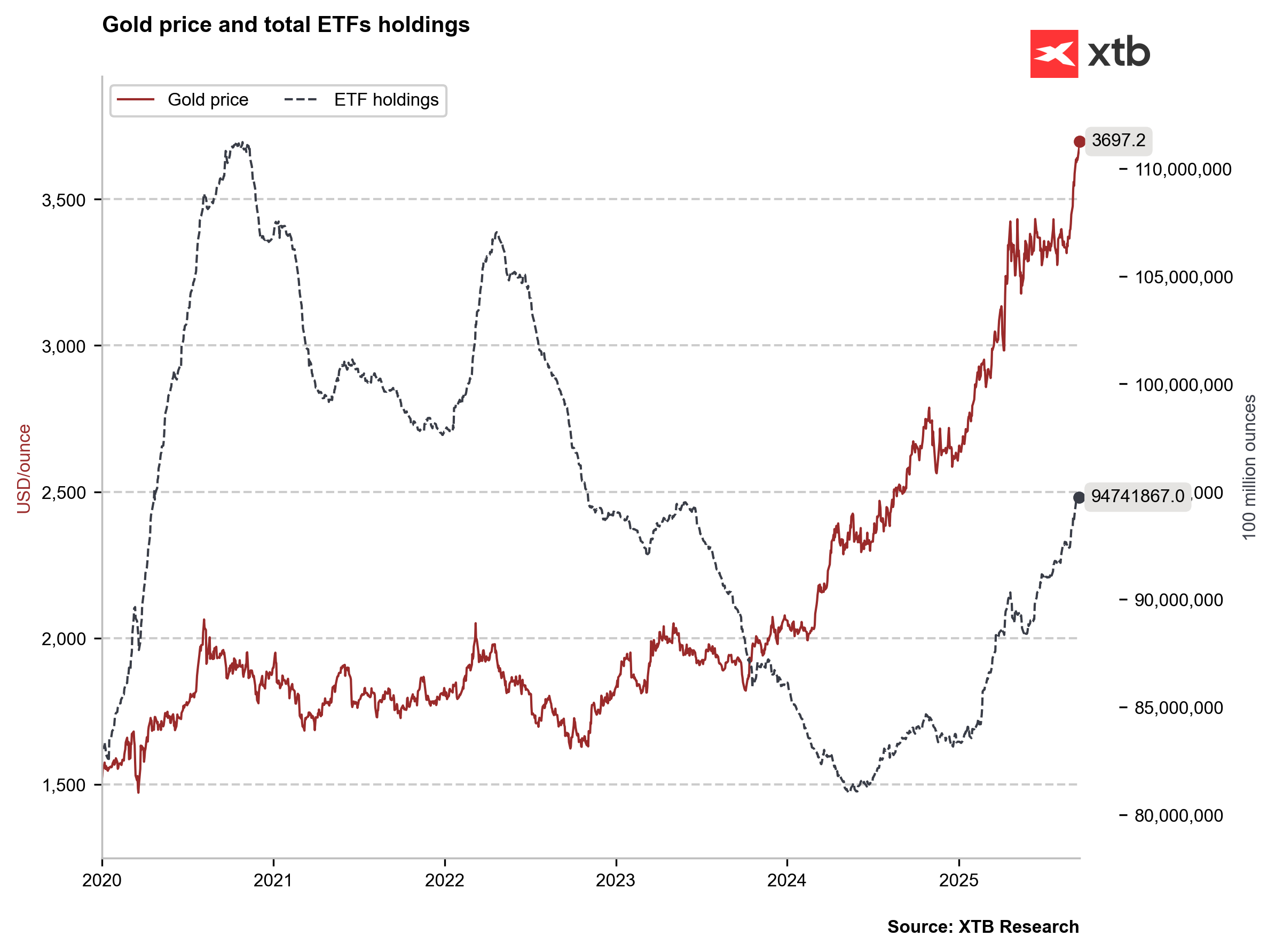 Ilość złota w skarbcach ETF sięga już najwyższego poziomu od końca 2022 roku. Źródło: Bloomberg Finance LP, XTB