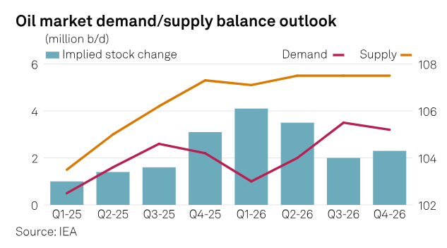 IEA prognozuje potężną nadpodaż na rynku ropy w 2026 roku. Źródło: S&P Global, IEA