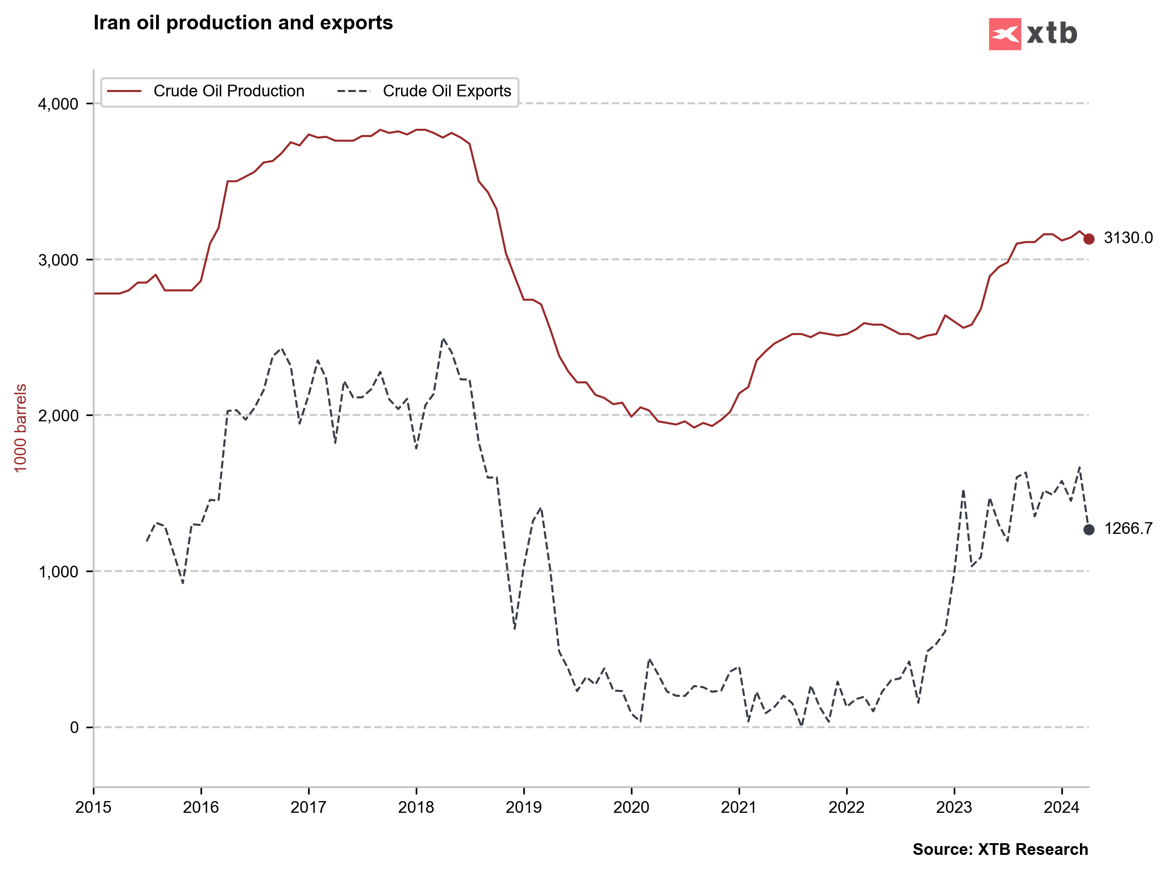 Eksport ropy z Iranu spada. Warto pamiętać, że głównym odbiorcą irańskiej ropy są Chiny. Źródło: Bloomberg Finance LP, XTB