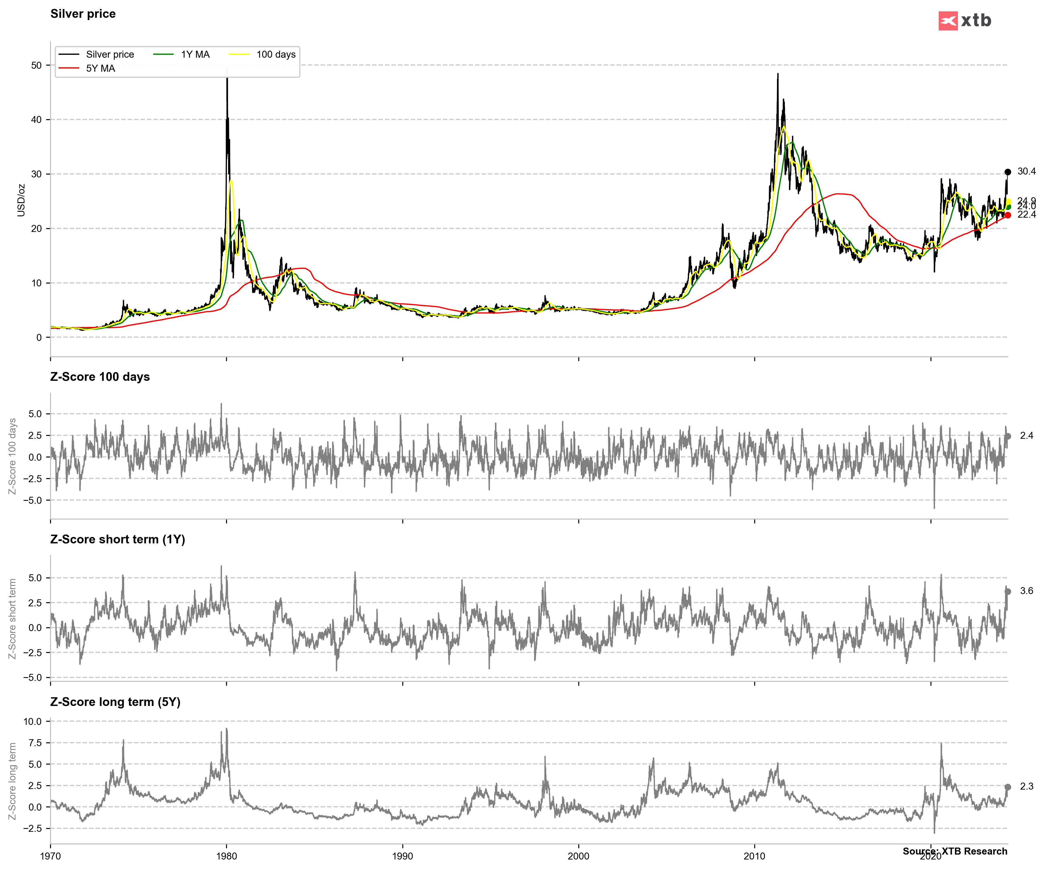 Srebro dało słaby sygnał wykupienia na 100 sesyjnej średniej, ale nie jest to jeszcze mocny sygnał na 1 rocznej średniej. Jest jeszcze daleko do wykupienia na 5 letniej średniej. Źródło: Bloomberg Finance LP, XTB
