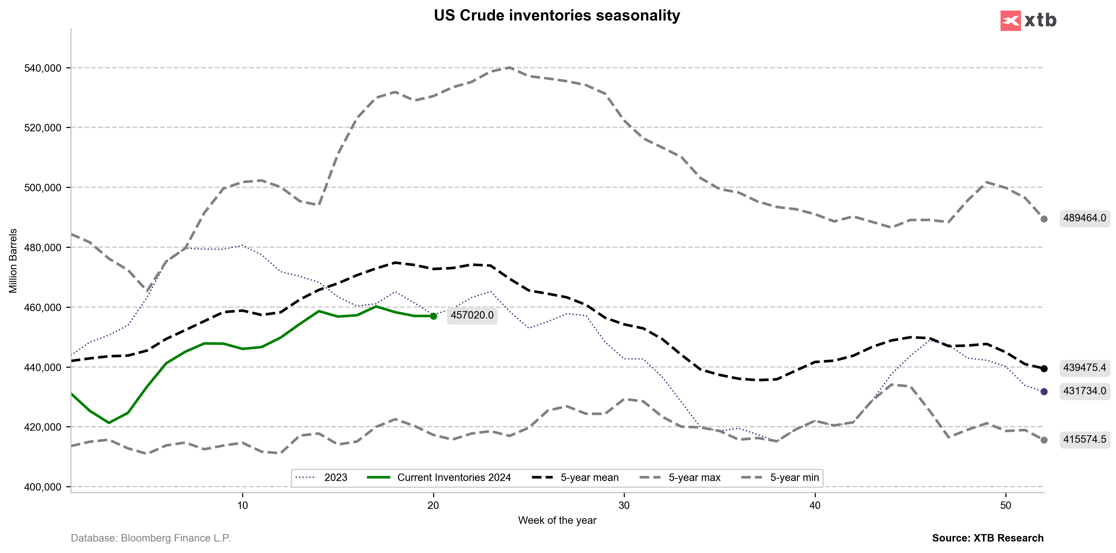 Zapasy ropy w USA pozostają poniżej 5 letniej średniej. Źródło: Bloomberg Finance LP, XTB