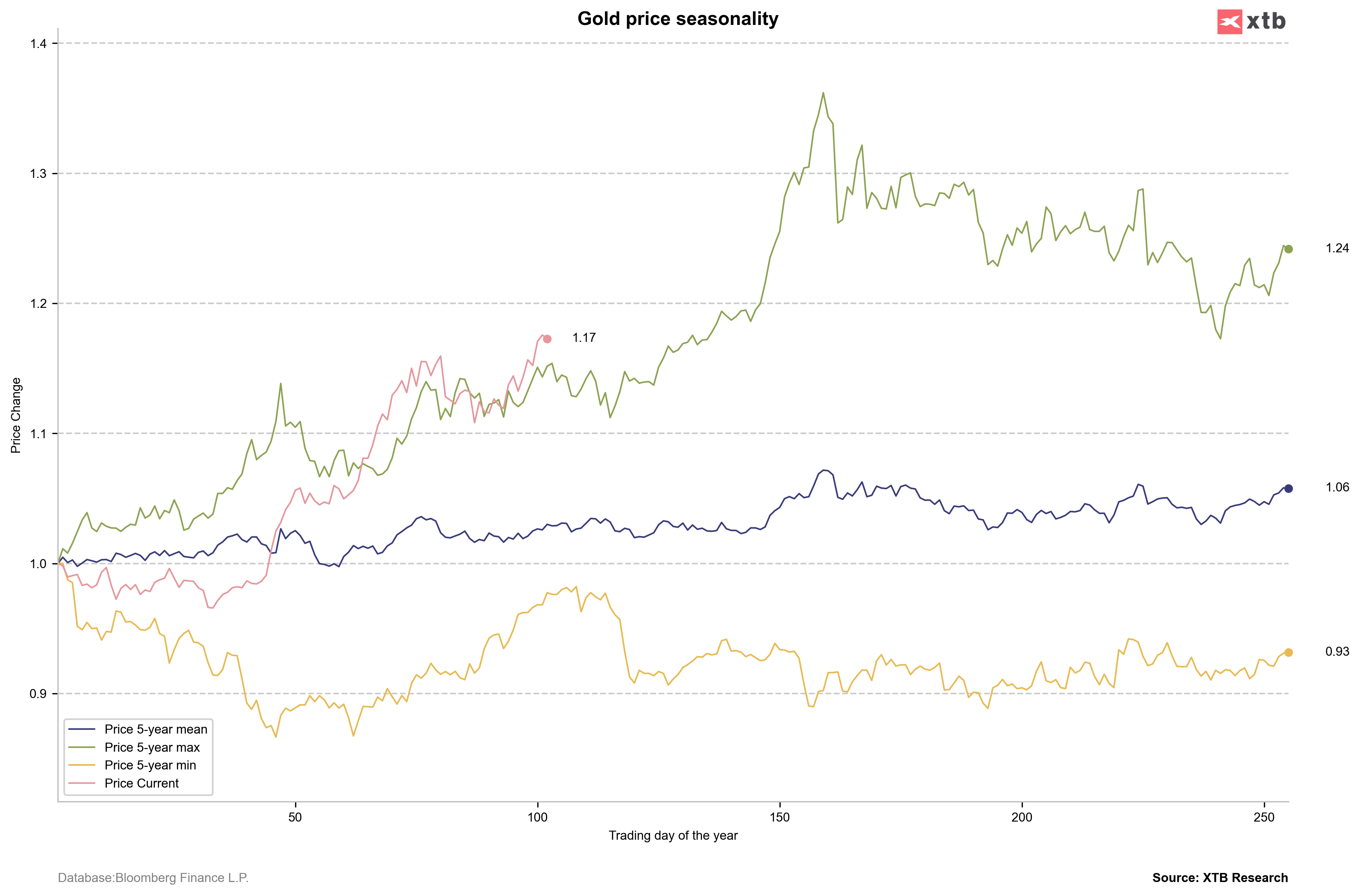 Złoto porusza się zgodnie z 5 letnim maksymalnym zachowaniem. To mogłoby sugerować konsolidację w najbliższych 2 tygodniach, ale później kontynuację silnych wzrostów, w szczególności w okolicach 130-150 sesji w roku. Źródło: Bloomberg Finance LP, XTB